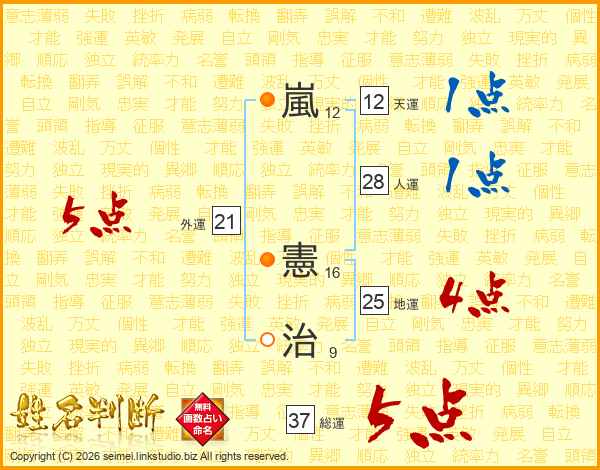 嵐憲治さんの総運は37画の5点!
