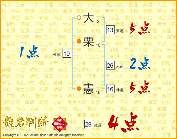 あなたの人生を表す1番重要な運勢です。生涯を通じて影響する総合運となり、主に50歳以降の晩年期に影響を及ぼします。苗字と名前の合計画数。