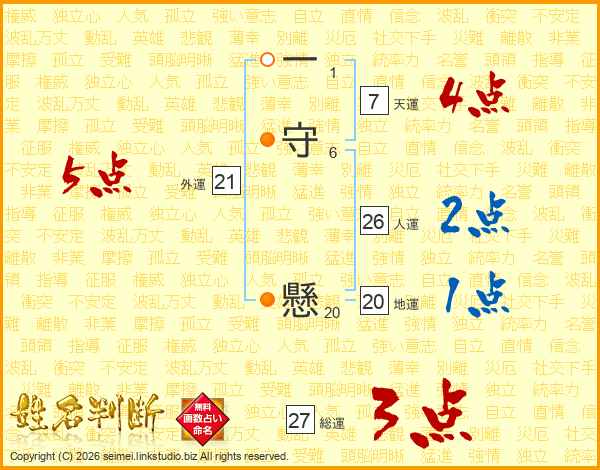 生活面を象徴する運勢です。外部から受ける影響力を表し、結婚運、家庭運や職場、環境への順応性を表します。総運から人運を引いた画数。姓や名が1文字の場合を除く。