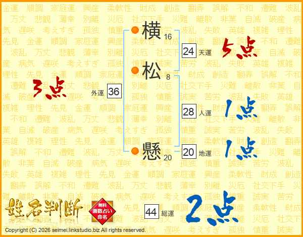 生活面を象徴する運勢です。外部から受ける影響力を表し、結婚運、家庭運や職場、環境への順応性を表します。総運から人運を引いた画数。姓や名が1文字の場合を除く。