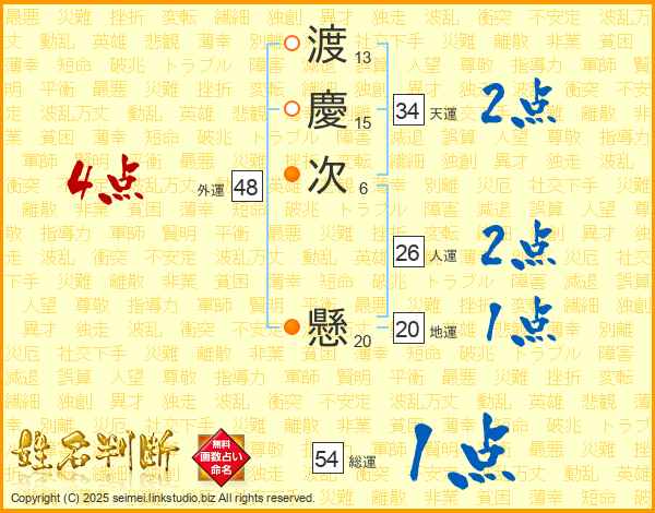 渡(13画)慶(15画)次(6画) 懸(20画)
