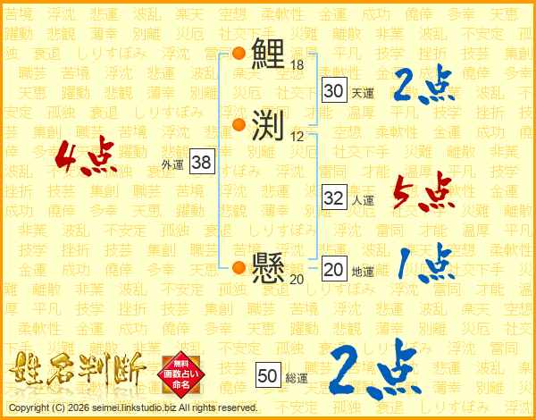 生活面を象徴する運勢です。外部から受ける影響力を表し、結婚運、家庭運や職場、環境への順応性を表します。総運から人運を引いた画数。姓や名が1文字の場合を除く。