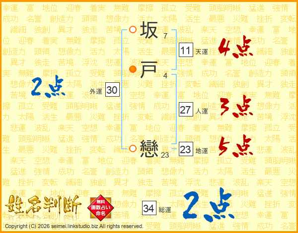 生活面を象徴する運勢です。外部から受ける影響力を表し、結婚運、家庭運や職場、環境への順応性を表します。総運から人運を引いた画数。姓や名が1文字の場合を除く。