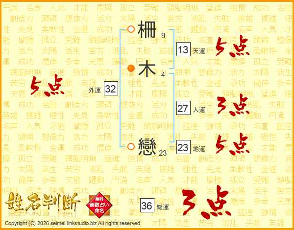 あなたの人生を表す1番重要な運勢です。生涯を通じて影響する総合運となり、主に50歳以降の晩年期に影響を及ぼします。苗字と名前の合計画数。