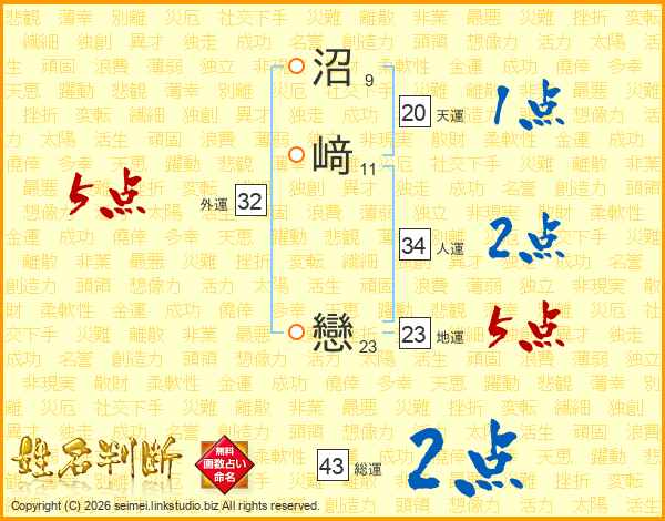 生活面を象徴する運勢です。外部から受ける影響力を表し、結婚運、家庭運や職場、環境への順応性を表します。総運から人運を引いた画数。姓や名が1文字の場合を除く。