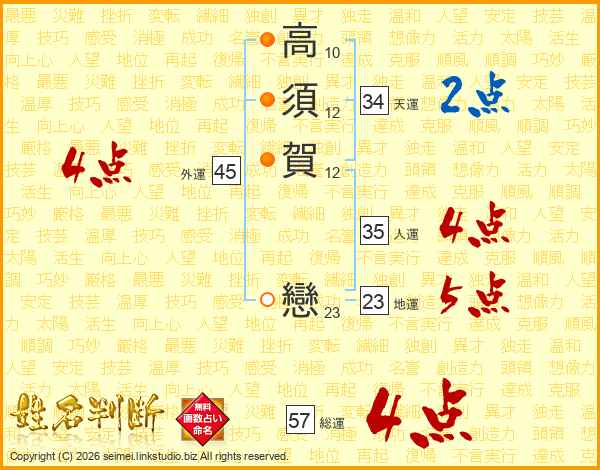 生活面を象徴する運勢です。外部から受ける影響力を表し、結婚運、家庭運や職場、環境への順応性を表します。総運から人運を引いた画数。姓や名が1文字の場合を除く。