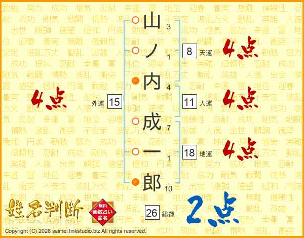 山(3画)ノ(1画)内(4画) 成(7画)一(1画)郎(10画)