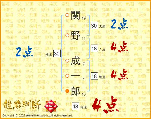 関(19画)野(11画) 成(7画)一(1画)郎(10画)
