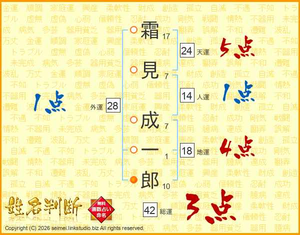 霜(17画)見(7画) 成(7画)一(1画)郎(10画)