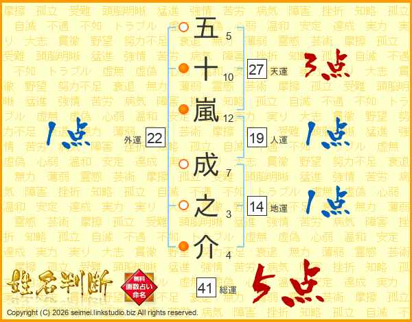五十嵐成之介さんの総運は41画の5点!