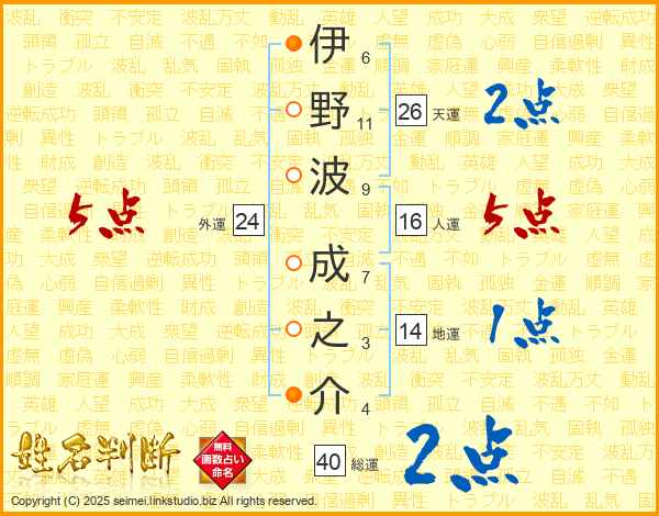 伊(6画)野(11画)波(9画) 成(7画)之(3画)介(4画)