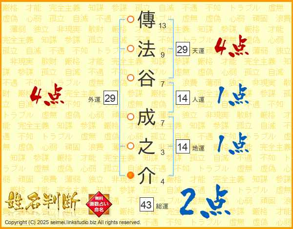 生活面を象徴する運勢です。外部から受ける影響力を表し、結婚運、家庭運や職場、環境への順応性を表します。総運から人運を引いた画数。姓や名が1文字の場合を除く。