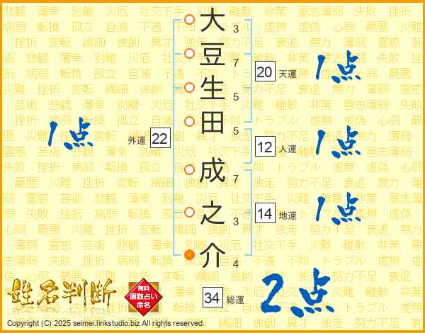 大豆生田成之介さんの総運は34画の2点!