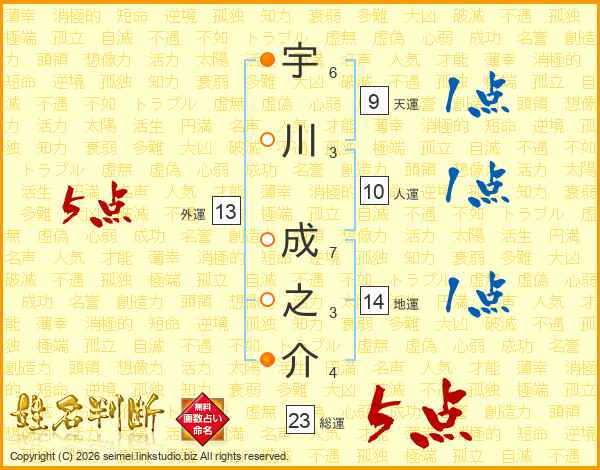 宇川成之介さんの総運は23画の5点!