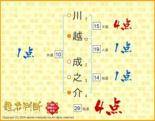 川(3画)越(12画) 成(7画)之(3画)介(4画)