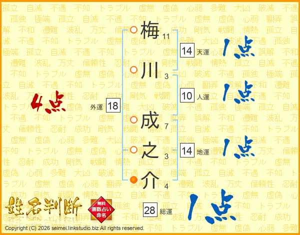 梅(11画)川(3画) 成(7画)之(3画)介(4画)