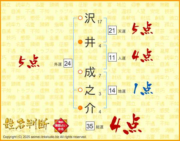 沢(17画)井(4画) 成(7画)之(3画)介(4画)