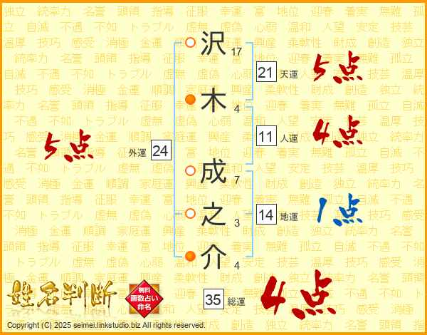 沢(17画)木(4画) 成(7画)之(3画)介(4画)
