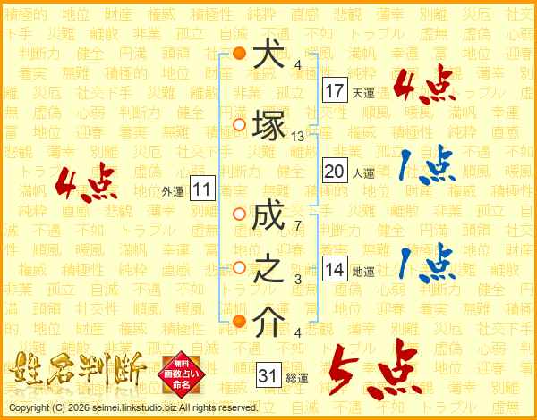 犬塚成之介さんの総運は31画の5点!
