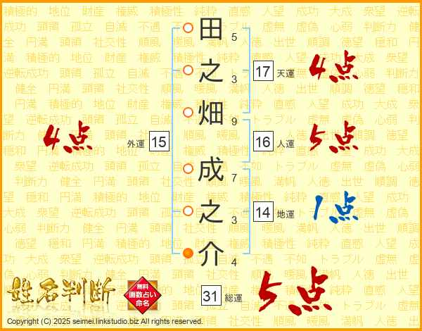 田(5画)之(3画)畑(9画) 成(7画)之(3画)介(4画)