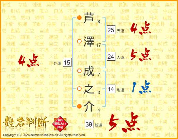 芦澤成之介さんの総運は39画の5点!