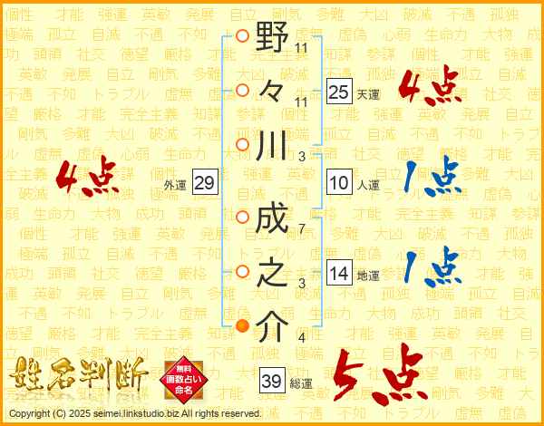 野(11画)々(11画)川(3画) 成(7画)之(3画)介(4画)