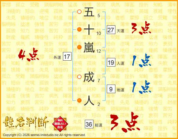 五(5画)十(10画)嵐(12画) 成(7画)人(2画)