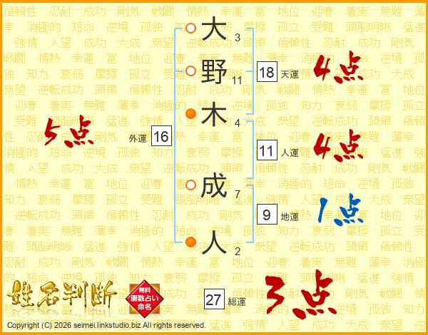 大(3画)野(11画)木(4画) 成(7画)人(2画)
