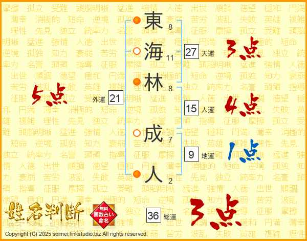 東(8画)海(11画)林(8画) 成(7画)人(2画)