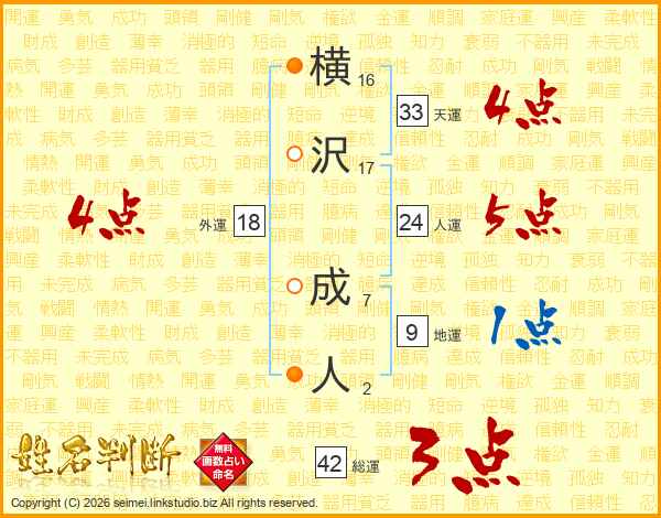 横沢成人さんの総運は42画の3点!