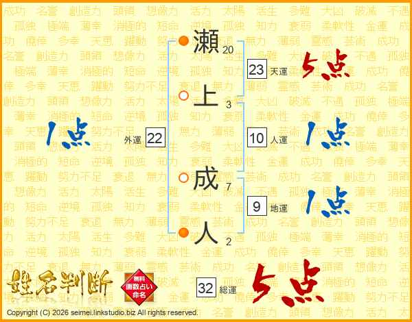 瀬上成人さんの総運は32画の5点!