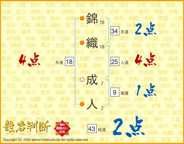錦(16画)織(18画) 成(7画)人(2画)