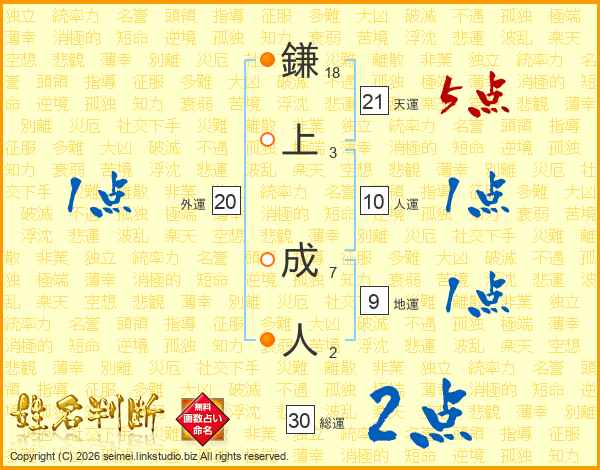 鎌上成人さんの天運は21画の5点!