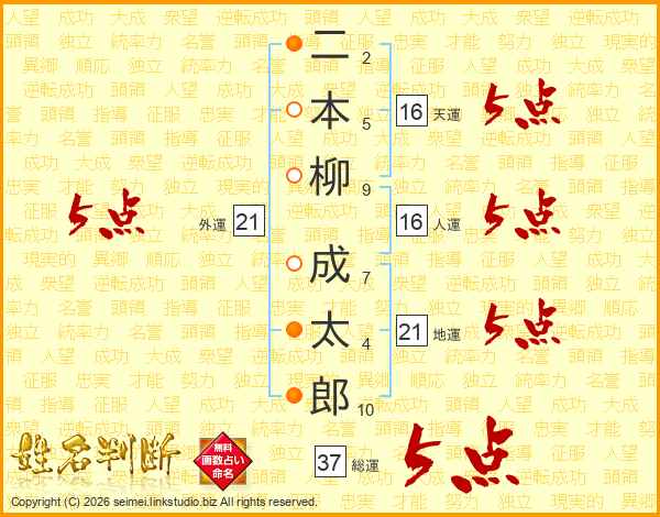 二本柳成太郎さんの総運は37画の5点!