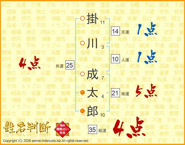 掛(11画)川(3画) 成(7画)太(4画)郎(10画)