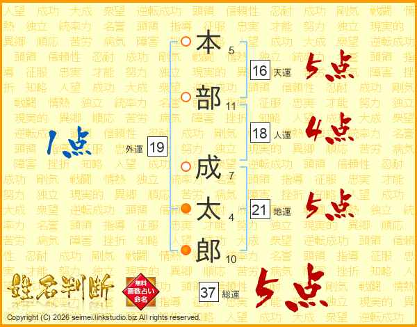 本(5画)部(11画) 成(7画)太(4画)郎(10画)