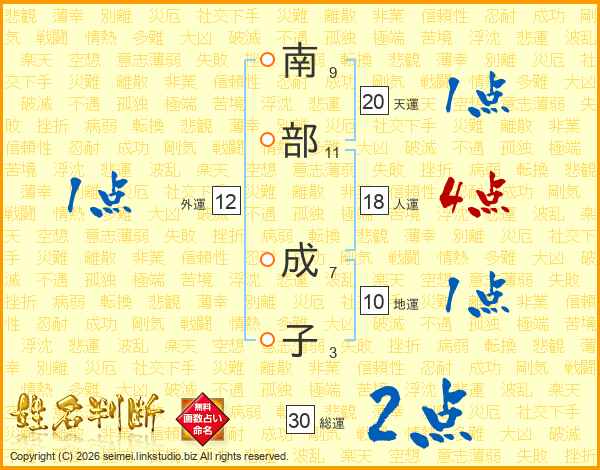 生活面を象徴する運勢です。外部から受ける影響力を表し、結婚運、家庭運や職場、環境への順応性を表します。総運から人運を引いた画数。姓や名が1文字の場合を除く。