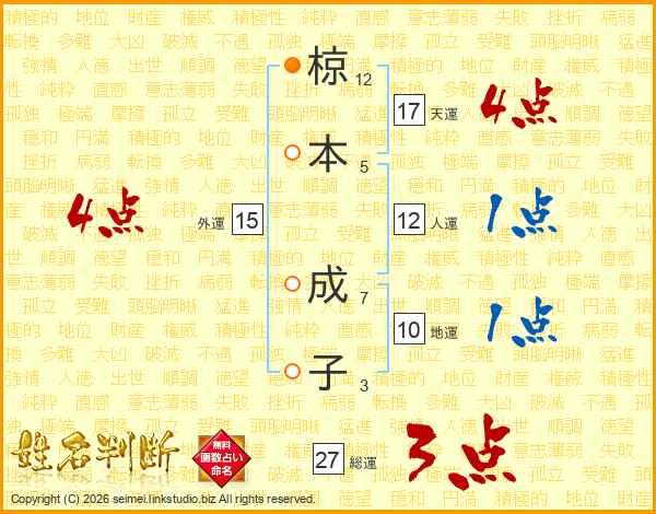 あなたの人生を表す1番重要な運勢です。生涯を通じて影響する総合運となり、主に50歳以降の晩年期に影響を及ぼします。苗字と名前の合計画数。