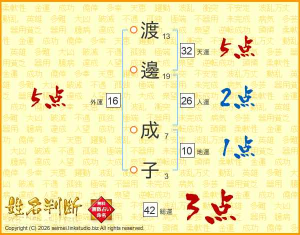渡(13画)邊(19画) 成(7画)子(3画)