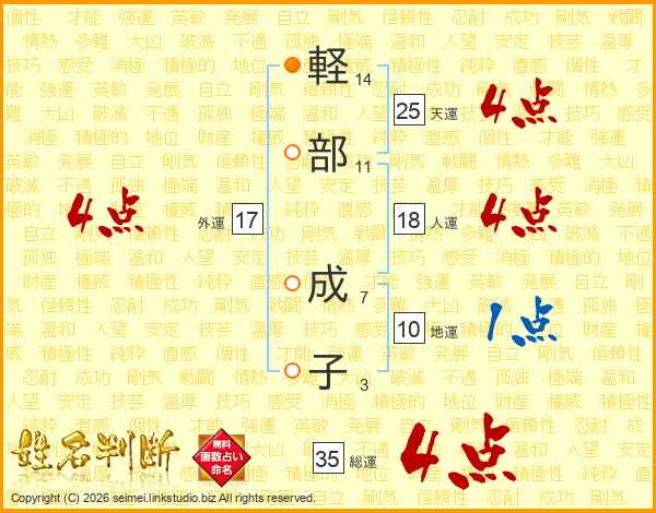 生活面を象徴する運勢です。外部から受ける影響力を表し、結婚運、家庭運や職場、環境への順応性を表します。総運から人運を引いた画数。姓や名が1文字の場合を除く。
