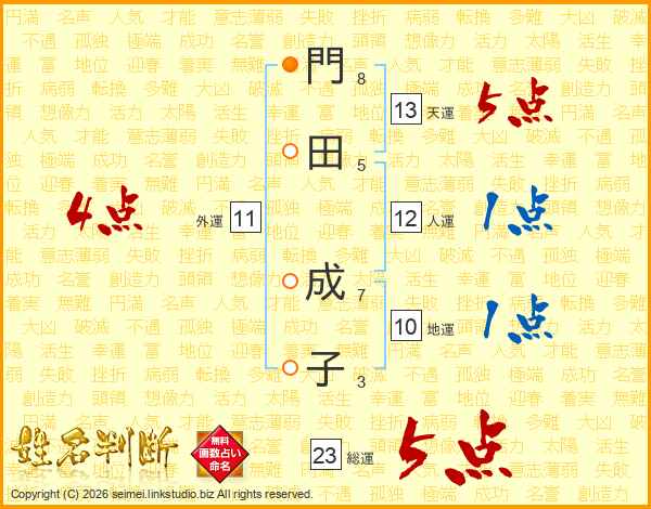 生活面を象徴する運勢です。外部から受ける影響力を表し、結婚運、家庭運や職場、環境への順応性を表します。総運から人運を引いた画数。姓や名が1文字の場合を除く。
