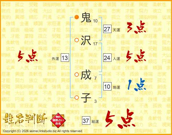鬼(10画)沢(17画) 成(7画)子(3画)