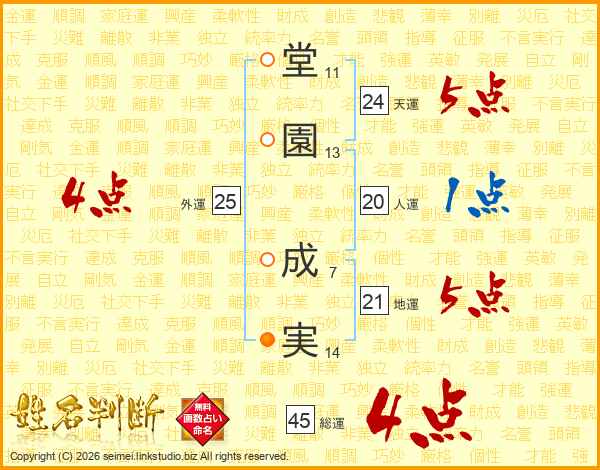 堂(11画)園(13画) 成(7画)実(14画)