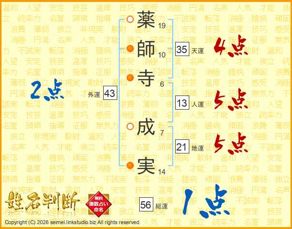 薬(19画)師(10画)寺(6画) 成(7画)実(14画)