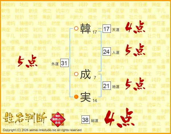 韓(17画) 成(7画)実(14画)