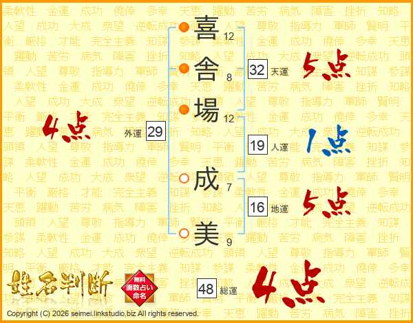 喜(12画)舎(8画)場(12画) 成(7画)美(9画)
