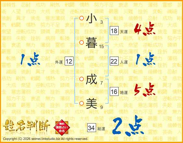あなたの人生を表す1番重要な運勢です。生涯を通じて影響する総合運となり、主に50歳以降の晩年期に影響を及ぼします。苗字と名前の合計画数。