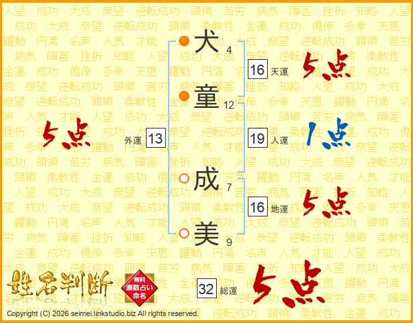 犬(4画)童(12画) 成(7画)美(9画)