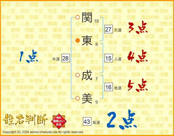 関(19画)東(8画) 成(7画)美(9画)