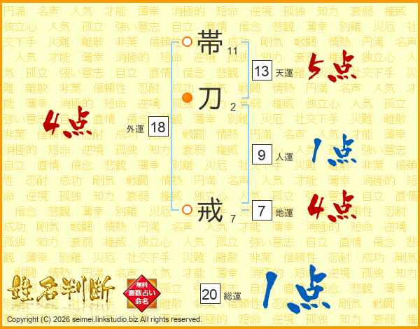 生活面を象徴する運勢です。外部から受ける影響力を表し、結婚運、家庭運や職場、環境への順応性を表します。総運から人運を引いた画数。姓や名が1文字の場合を除く。